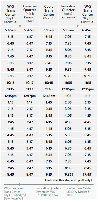Connect to The Winston-Salem Transit Authority (WSTA) at the Clark Campbell Transportation Center, Bay L-1, 100 West 5th Street. Visit the WSTA Website