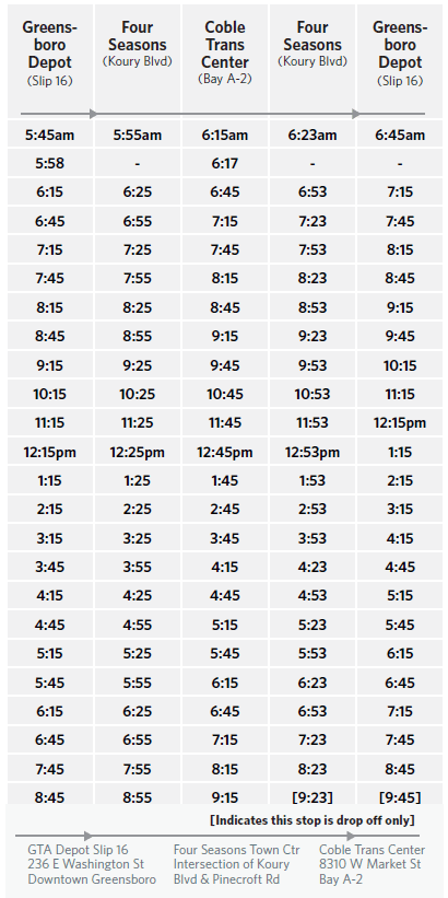 The Greensboro Express connects the Greensboro Galyon Depot with the Coble Transportation Center in Greensboro. Passengers can transfer at the Coble Transportation Center to Route 1 Winston-Salem Express, Route 3 High Point Express or the Airport Area Shuttles. Free parking is offered to PART Express riders.